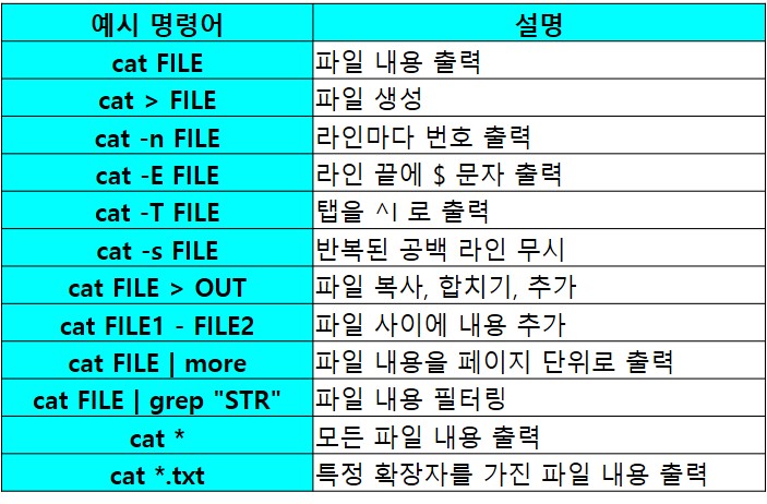 > 파일의 내용을 화면에 출력, 리다이렉션 기호('>')를 사용하여 새로운 파일 생성