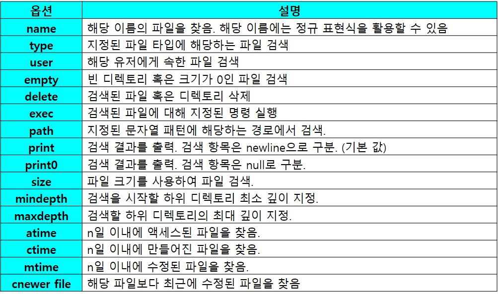 | ex) find . -name "*test*" # 현재 위치에서 test가 들어가는 파일 찾기 |