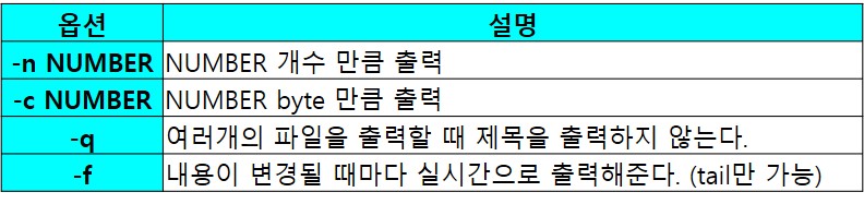 | tail [옵션] [number] [파일이름] # 1개의 파일 출력. 기본출력 개수는 10개이다. tail [옵션] [number] [파일이름1] [파일이름2]... # 여러개의 파일 출력 |