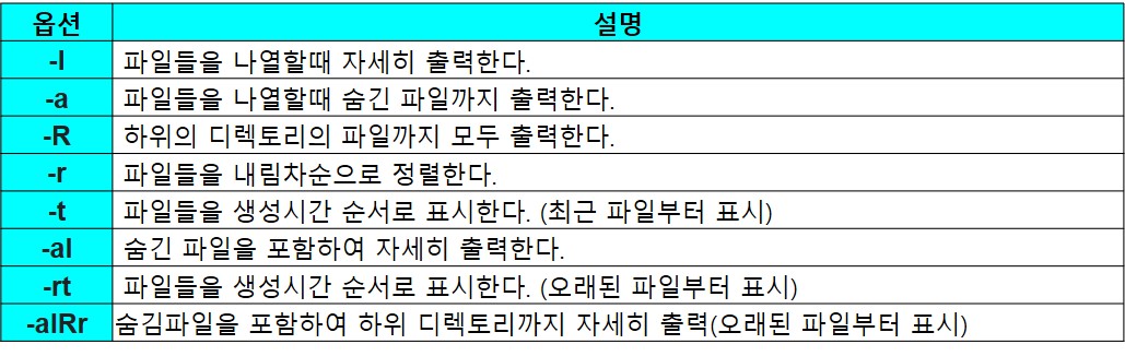 > list의 약자로, 디렉토리에 있는 내용(디렉토리, 파일) 리스트를 출력하는 명령어