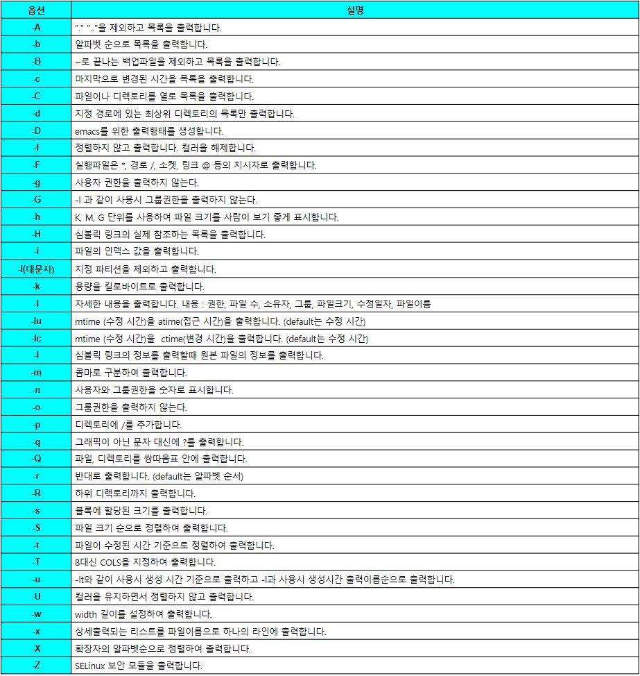 | ls [옵션] [파일] # 파일 목록 출력 ls[옵션][디렉토리] # 디렉토리 목록 출력 |