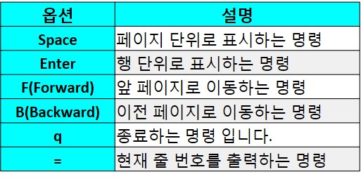 > 쉬운 설명 : 길이가 긴 파일을 화면 단위로 끊어서 출력하는 명령어이다.