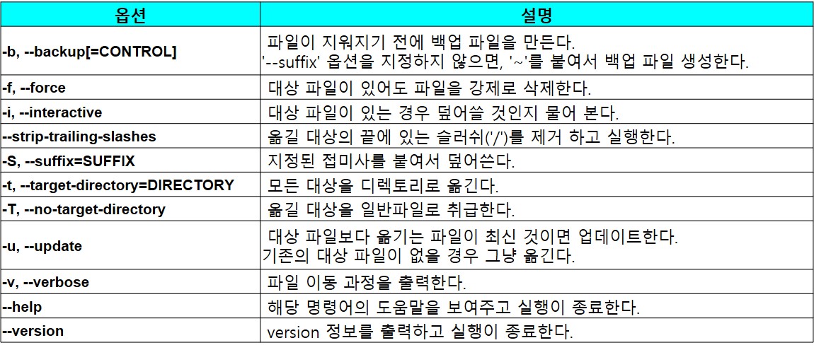 > move의 약자로 파일이나 디렉토리를 이동 시킬때 사용하는 명령어