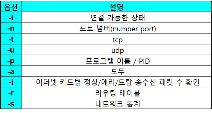 | netstat 옵션 # 기본 사용 방법 netstat 옵션 | grep 포트 번호 # 특정 포트에 대한 정보 netstat 옵션 | grep 서비스명 # 특정 서비스에 대한 정보 # ex) https |